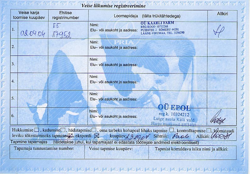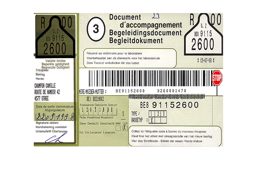 eines Muster eines Tierpasses, von Ohrmarken und eines Bestandsregisters sind