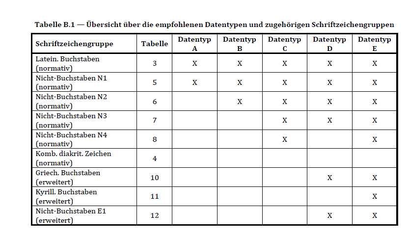 | Der Datentyp E wurde für alle normativen und erweiterten Schriftzeichen