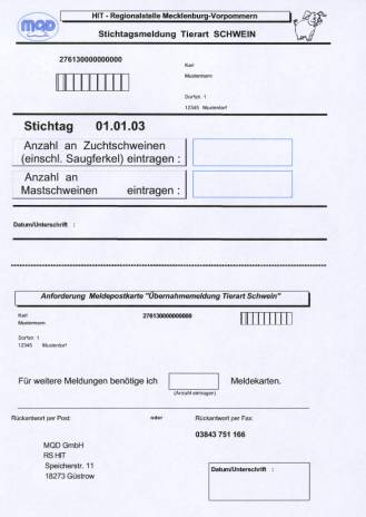 Diese Stichtagsmeldung macht aber die nach §24b der Viehverkehrsverordnung erforderliche Anzeige- und Betriebsregistrierung nicht überflüssig. Vielmehr ist sie für Schweinehalter als Erweiterung dieser Anzeigepflicht zu sehen.