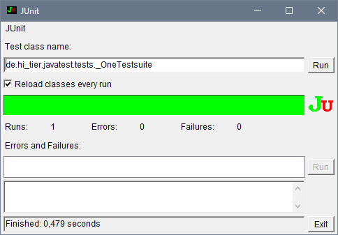 Anfang 2021 wurden die Javapakete umstruktriert, d.h. der frühere Aufruf von JUnit mit Javatest.tests._OneTestsuite funktioniert nicht mehr. Der korrekte ist de.hi_tier.javatest.tests._OneTestsuite (siehe auch Screenshot). Dies ist im Aufrufscript im Archiv berücksichtigt.