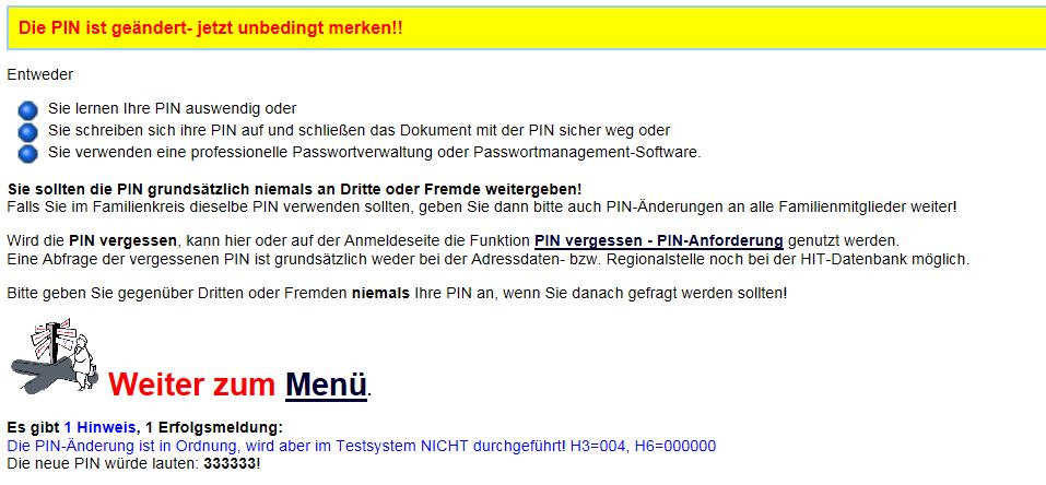 PIN zu wiederholen und die Schaltfläche <Ändern> zu klicken. Sofern die neue PIN vom System akzeptiert wurde, erfolgt die Rückmeldung "Die PIN ist geändert". Mit dem Button <Weiter zum Menü> gelangt man ins Hauptmenü.