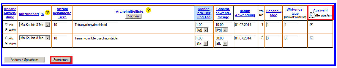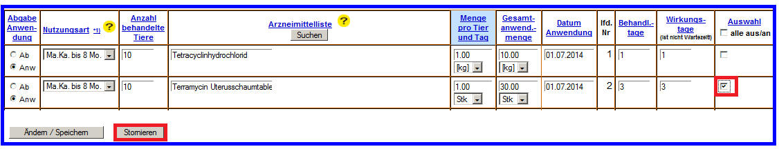 Ist an einem Tag mit einem Antibiotikum behandelt worden, welches noch zwei weitere Tage wirkt, ist dies folgendermaßen einzutragen: