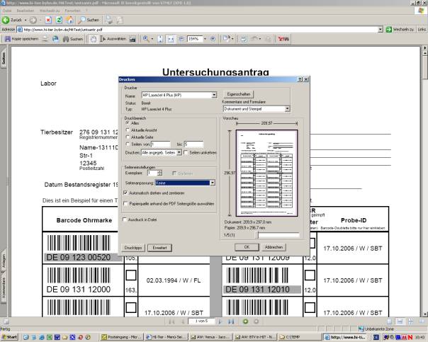 Wenn der Acrobat Reader auf Ihrem PC installiert ist, klicken Sie auf die PDF-Schaltfläche.  Der Acrobat Reader öffnet sich und es wird der Untersuchungsantrag als PDF-Dokument zunächst angezeigt. In Abhängigkeit von der Größe der Liste kann dieser Vorgang länger dauern.