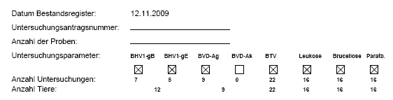Die landesspezifischen Formulare umfassen nicht alle Parameter, wie z.B. BTV oder BVD-Antikörper. Eine vollständige Auflistung ist auf der letzten Seite des Antrags zu finden.