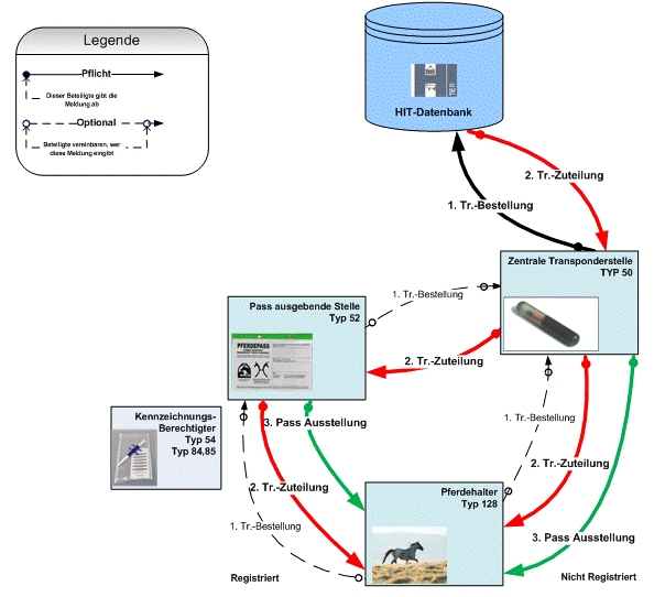 LINK Ablaufschema Die Zuteilungsmeldung stellt die Verknüpfung des Transponders mit dem Halter des Equiden her. Fehlt sie, kann die Pass ausgebende Stelle keine Passdaten in HIT melden und damit den Pass nicht ausgeben. Die sich aus der Arzneimittelbehandlung ergebende und zum Transponder